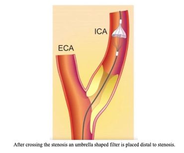 In this technique a catheter (tube) is introduced from leg artery upto carotid (neck) artery. After crossing the stenosis with a guidewire, a filter is placed distal to stenosis. The stenosis is dilated with a balloon and a stent is placed in the carotid artery over the stenotic site, thereby reopening the artery.